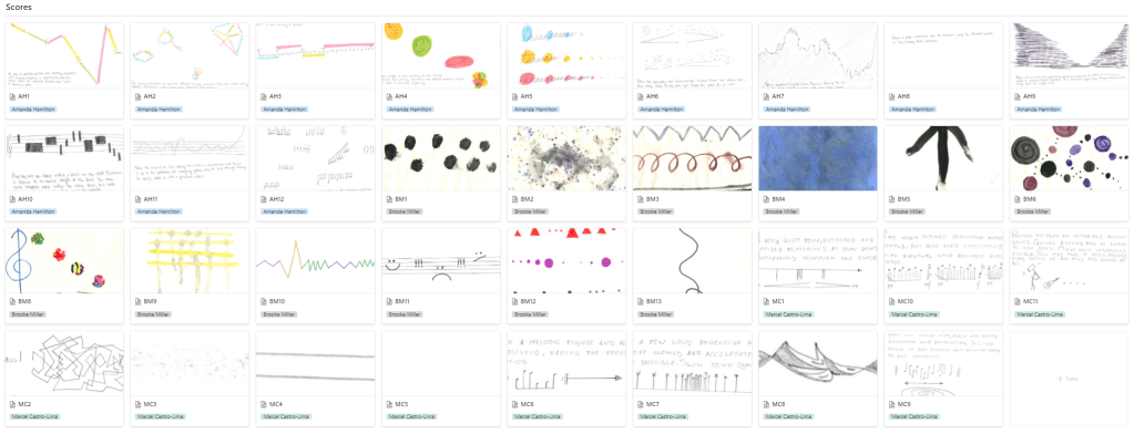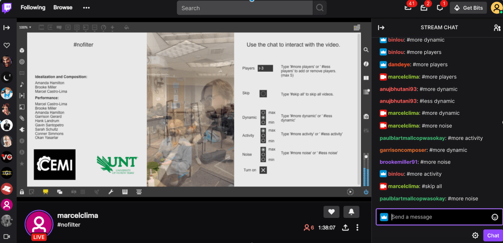 In #nofilter, all group members designed a set of graphic scores. Performers would then record a short video of themselves playing after one of the scores. We categorized a total of more than a hundred videos according to some parameters. A Max/MSP/Jitter patch called a video that corresponded to a specif combination of parameters. That combination could be changed interactively through the chat in a Twitch Stream. Finally, we streamed the final video to our room in Mozilla Hubs, which worked like a gallery, with all scores exhibited on the walls.